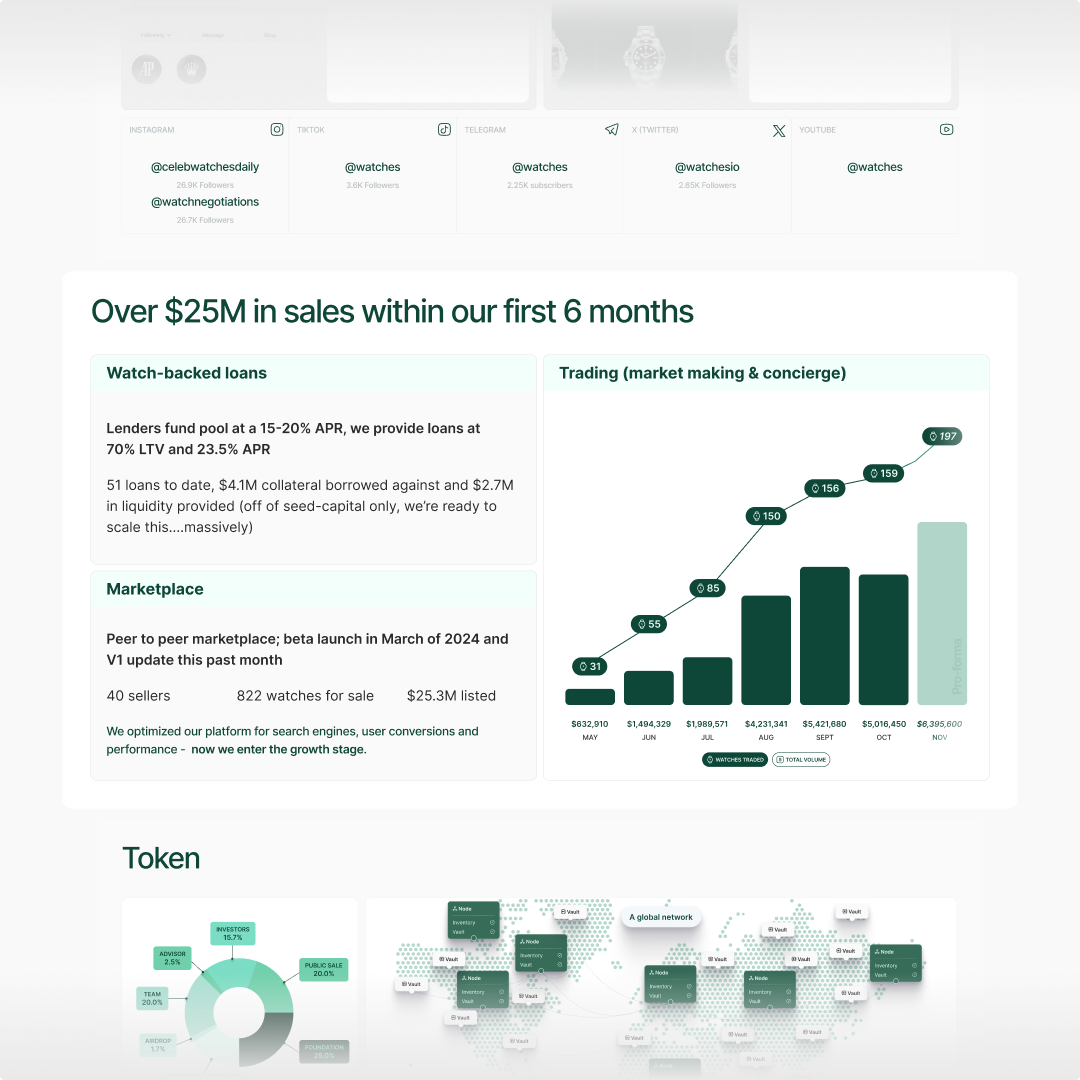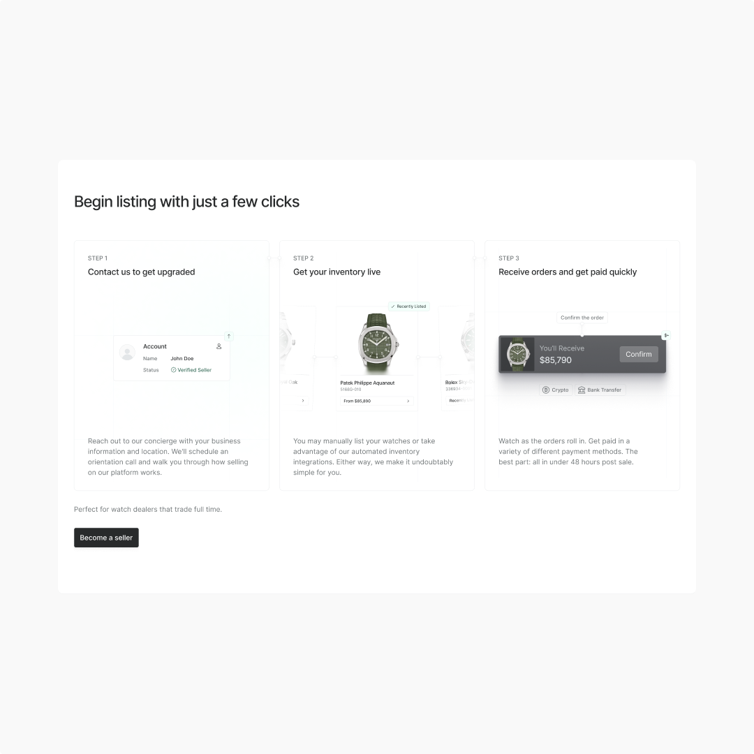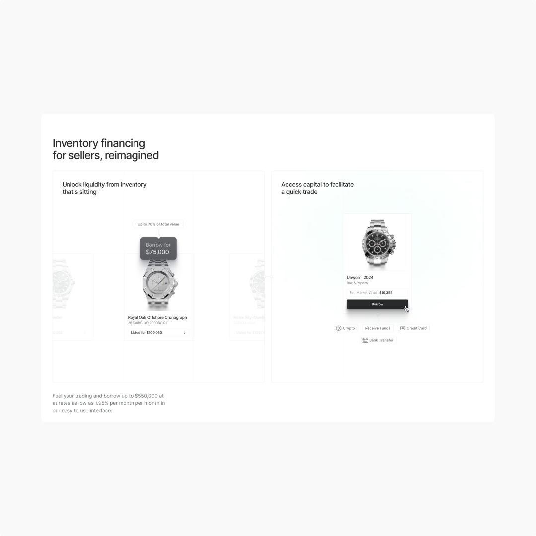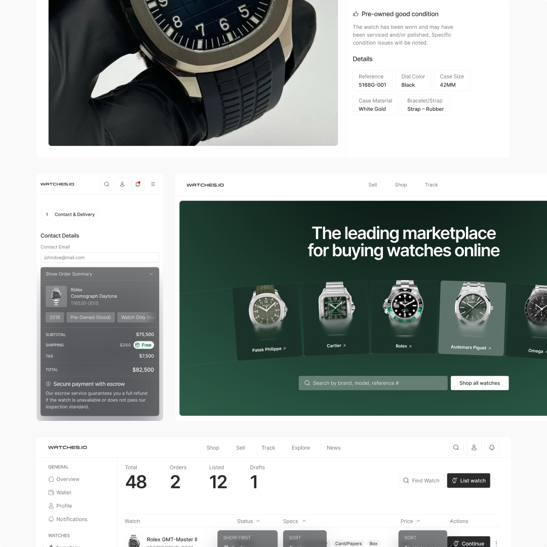 Later, as a Staff Product Designer, a team of designers was led to refine the product experience. The redesigned platform contributed to over $25 million in sales, and the work revolutionized how people interacted with luxury watches, introducing groundbreaking services like physical vaulting and loanable Watch-backed NFTs. Responsibilities included designing the core Watches.io product, the iOS app, and building the company's full design system, along with all media assets and social media.