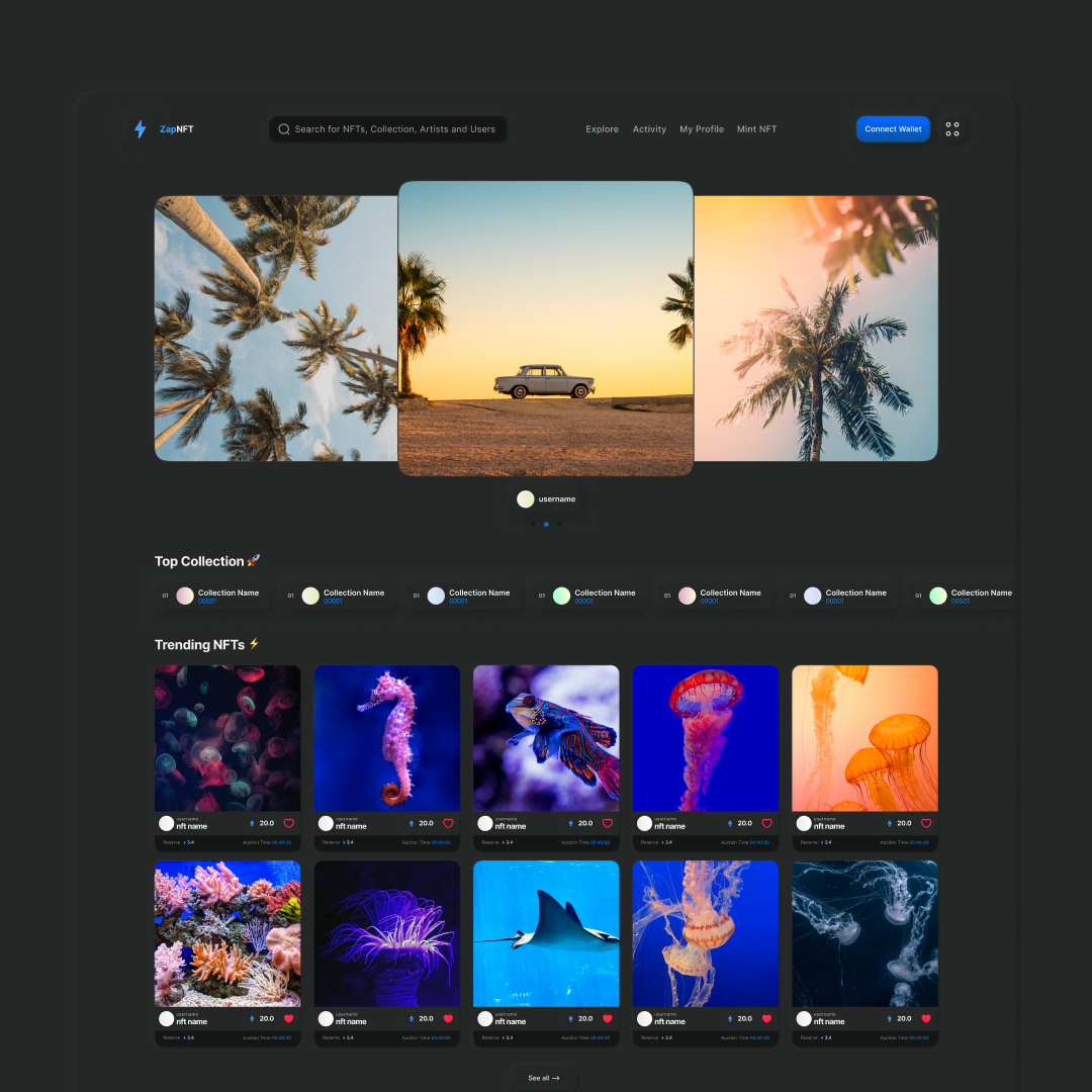 I established the visual identity and design guidelines for ZAP, which laid the foundation for their NFT marketplace, Oracle Platform, and other internal tools. My work also included creating social media graphics and user-generated content (UGC) guidelines.
